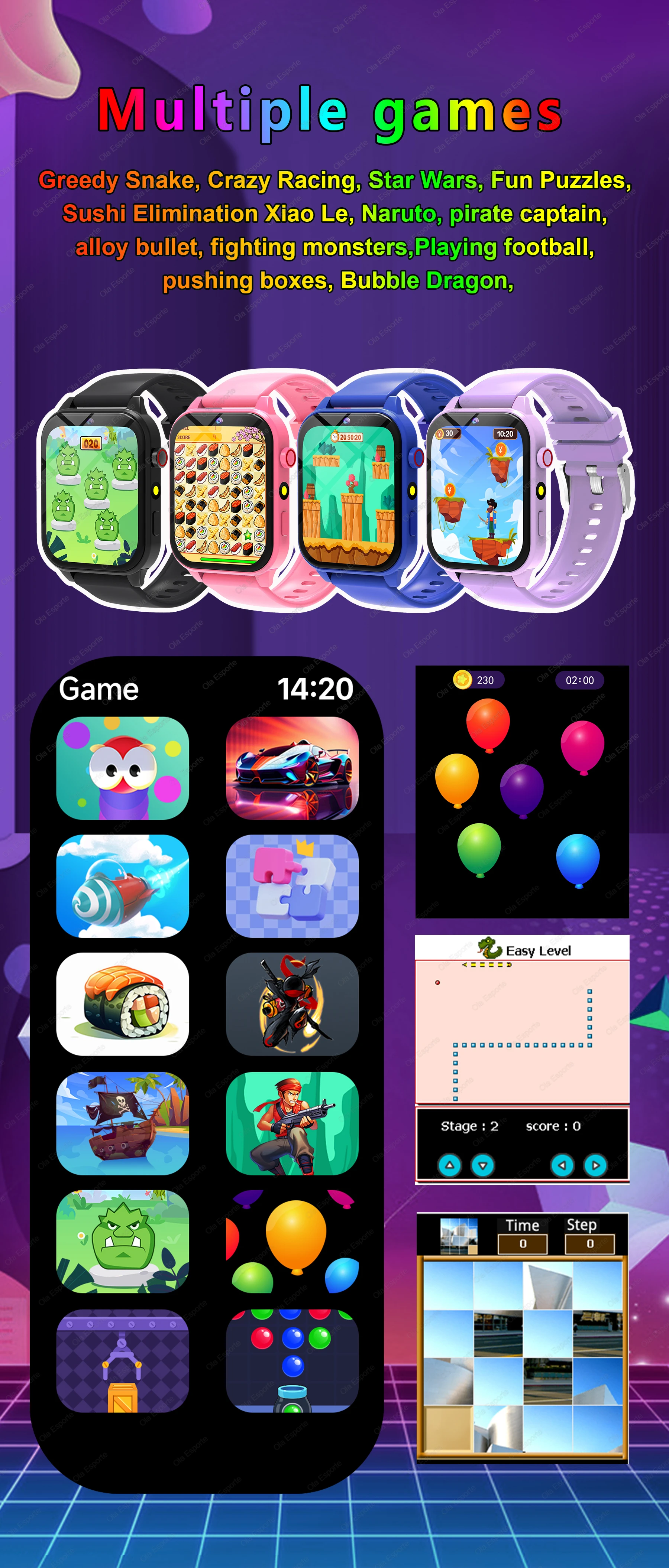 The watch comes pre-installed with a variety of classic and educational games, including Greedy Snake, Crazy Racing, Star Wars, Fun Puzzles, Sushi Elimination, Naruto, Pirate Captain, Alloy Bullet, Fighting Monsters, Playing Football, Pushing Boxes, and Bubble Dragon. These games help enhance logical thinking, reaction speed, and creativity, allowing kids to enjoy relaxing moments while learning and playing!