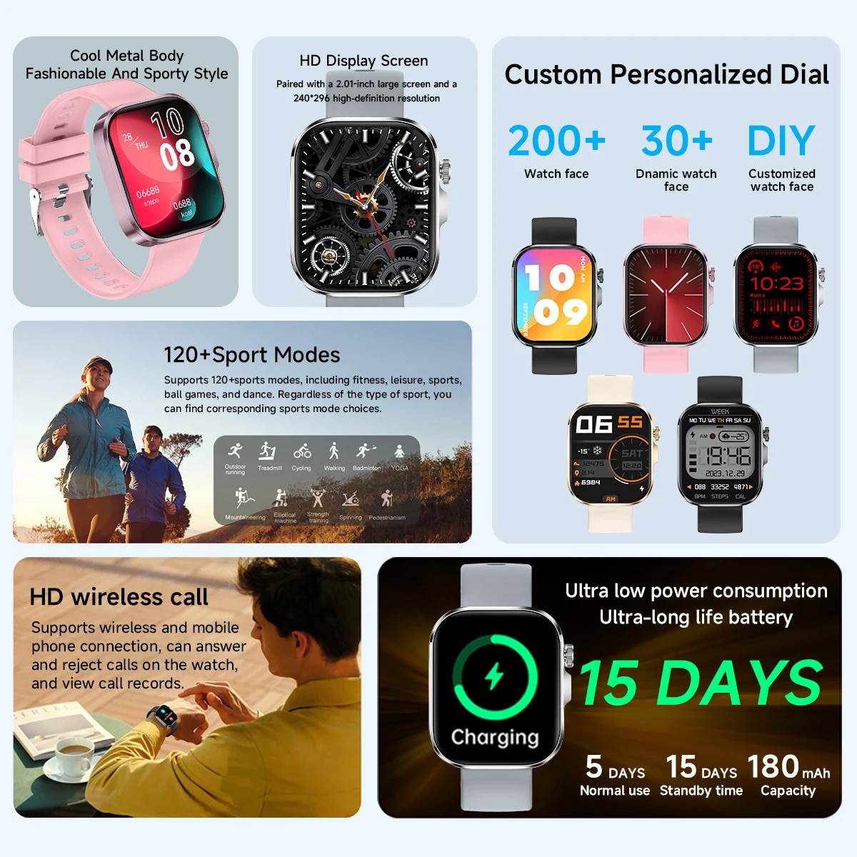 New 2.01'' HD Screen Fashion Flashlight Smart Watch Women Waterproof Sport Watches BT Call Health Monitoring Men Smartwatch 2026