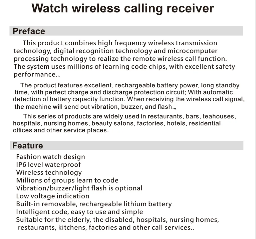 SU-691 Restaurant Pager Wireless Transmission Watch Receiver Waiter Call Waterproof for Hookah Cafe Dentist Clinic