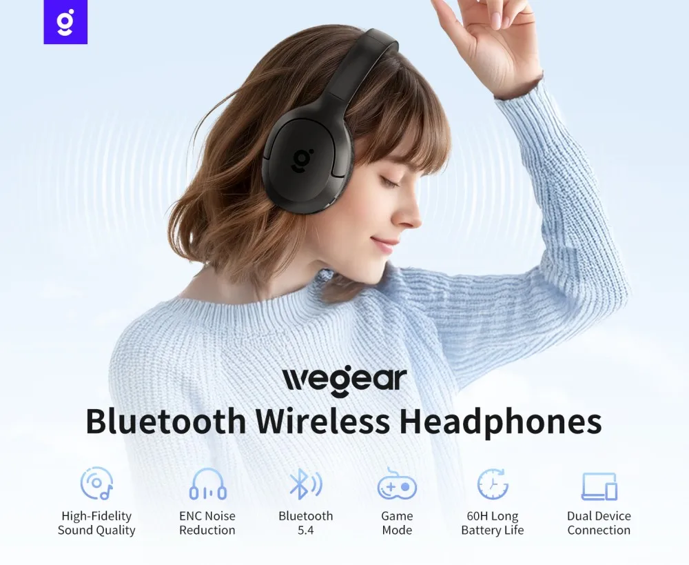 wegear HS7 Bluetooth Headphones Over Ear 60H Playtime with Microphone ENC Call Noise Cancelling Mic Foldable Wireless Headset